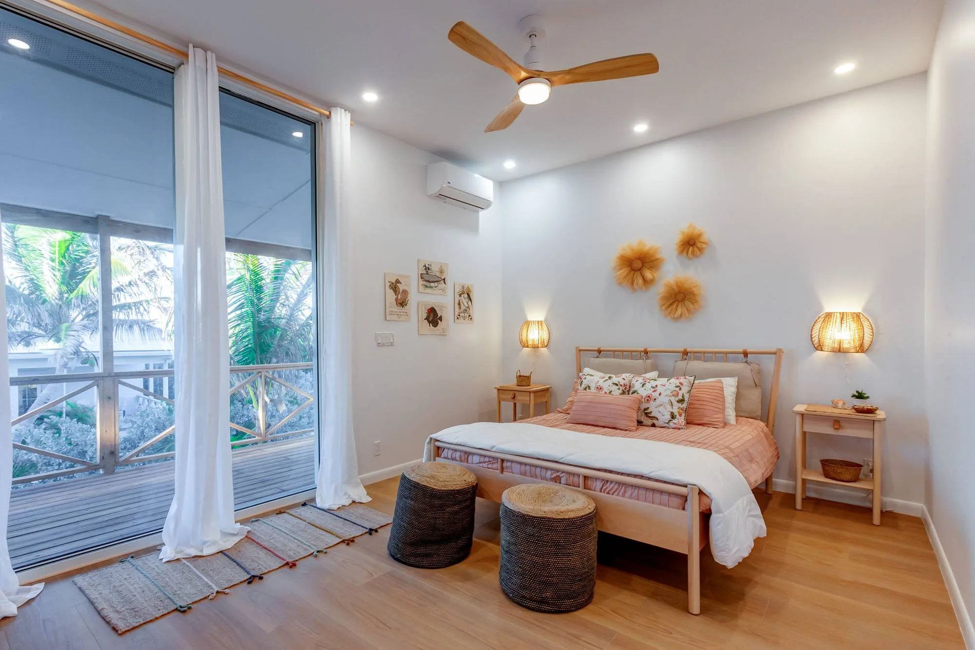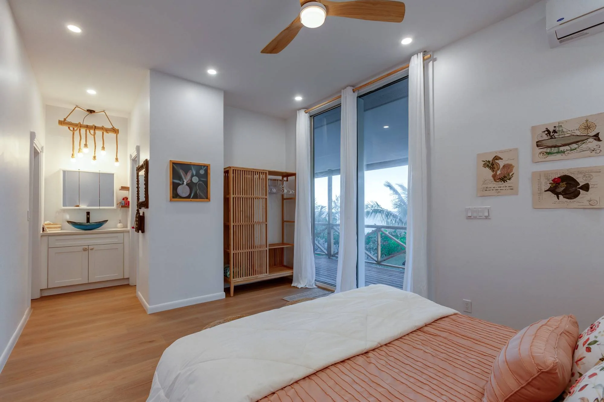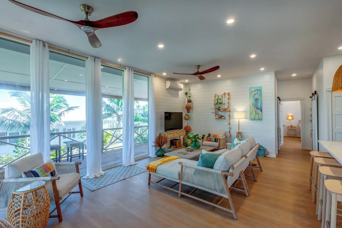 Light pours in through floor to ceiling windows and doors. A chef kitchen, comfy beds, 360° wraparound deck living— made for sea air, soft mornings, and sunset views.